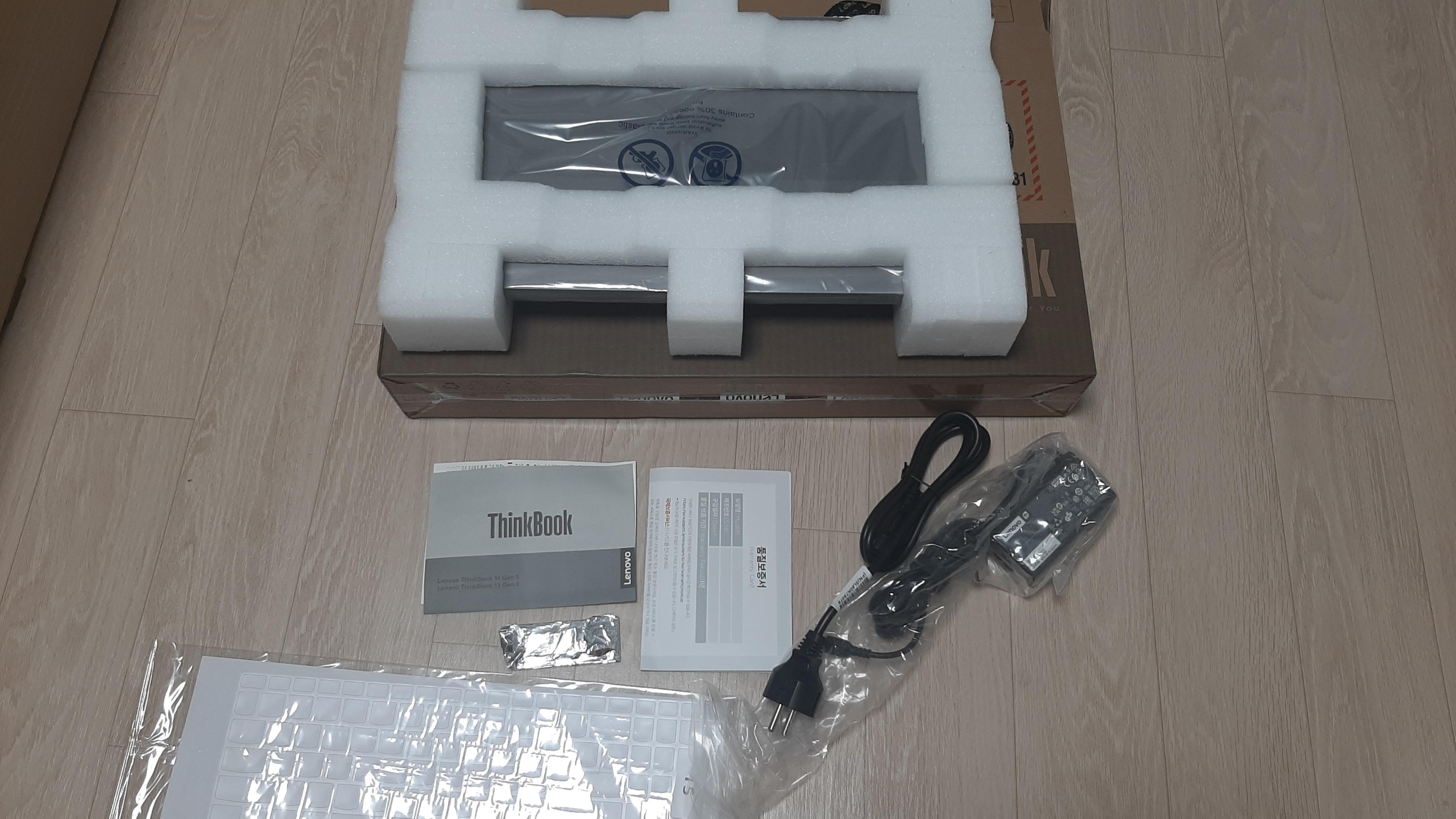 구성품은 노트북 본체, 전원 케이블, 간단 메뉴얼 2장, 사은품으로 온 키스킨과 8GB 램.