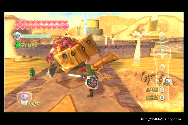 이번 작품은 모션플러스에 의해 '링크를 조작한다' 라기보다는 '링크가 된다' 라고 표현하는게 더 알맞다. 그러다보니 적들과의 전투 시에 적이 방어하지 않는 곳으로 검을 휘둘러야 한다. 이게 지금이야 익숙해져서 괜찮지만 처음에 시도할 때는 상당히 어렵다. 가장 허약한 몬스터와의 싸움에서도 방어를 겁나 잘하다보니(잡몹 주제에...) 이기기가 쉽지 않아 전체적인 난이도가 상승했다. (첫 플레이시에 처음 느끼는 좌절은 최초 '기라힘'과의 전투일 것이다. 내 공격 다 잡아☹) 거기다가 몬스터들이 주는 데미지도 많아져서 확실히 황공보다는 난이도가 높다. 괜히 첫 시작부터 하트 6개로 시작하는게 아니다. (젤다 시리즈의 전통은 하트 3개로 시작) 특히 마지막 전투를 처음했을 때는 진짜 아오...